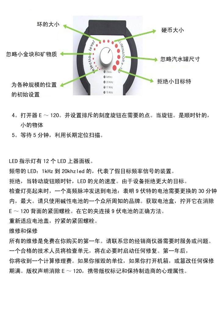 用戶通過使用“抑制電平”旋鈕調(diào)整來選擇消除器e-120 B過濾器的干擾抑制速度,以消除礦物質(zhì)-金塊、硬幣大小、蘇打罐大小或胸部大小的物體。