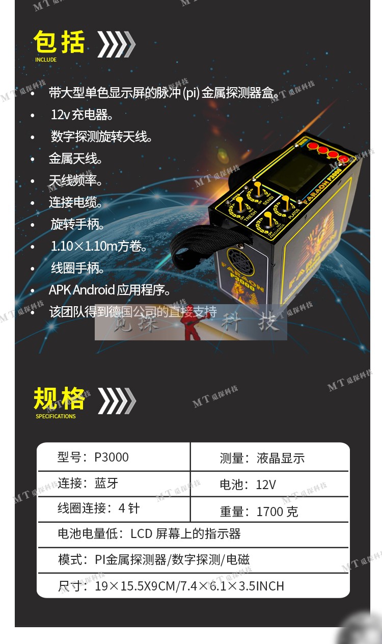 它是一種高科技脈沖感應(yīng) (pi) 金屬探測(cè)器,頻率為 200mhz 寬度(脈沖 170),包括一個(gè)旋轉(zhuǎn)天線以檢測(cè)數(shù)字占位和電磁場(chǎng),該設(shè)備是隱藏寶藏搜索的理想選擇,它提供 20 米的功率深度和 1000 米遠(yuǎn)的旋轉(zhuǎn)天線模式。